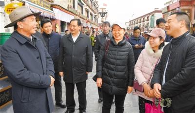 2月19日下午,區(qū)黨委副書記、自治區(qū)主席齊扎拉前往八廓街調(diào)研“冬季旅游”市場及服務(wù)保障工作。這是齊扎拉正在向來自湖北的游客詢問“冬季旅游”優(yōu)惠政策落實情況。潘多 攝