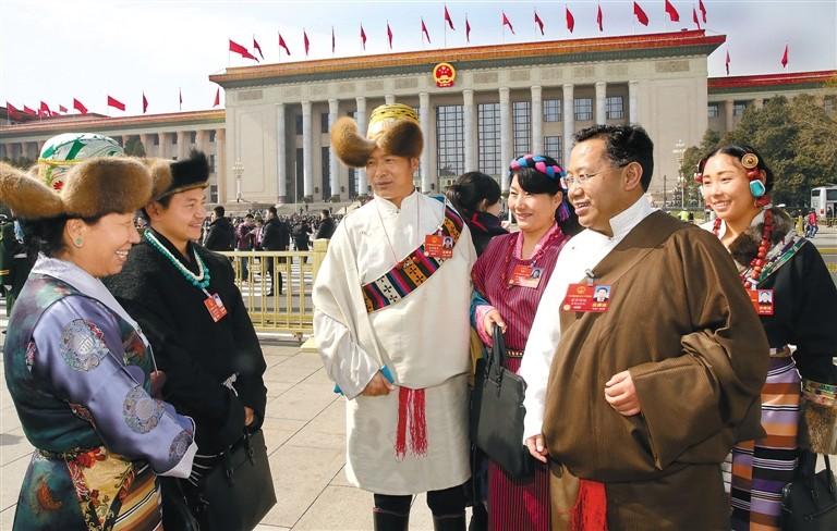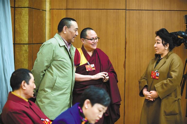 西藏的全國(guó)人大代表聆聽完政府工作報(bào)告后,在會(huì)場(chǎng)外開心交流。記者 姚海全 攝