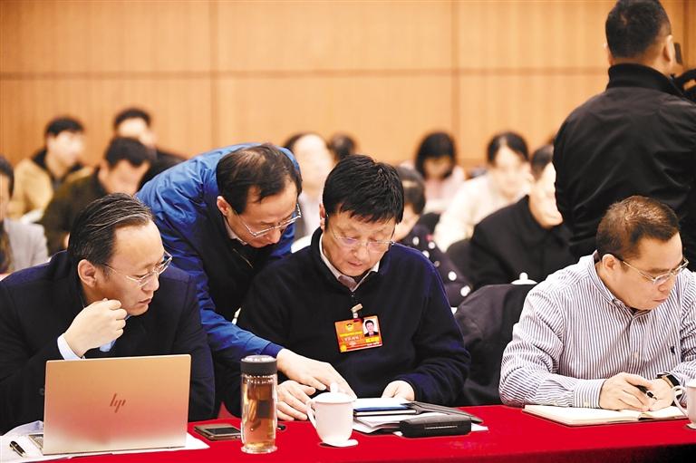 西藏全國(guó)政協(xié)委員朗杰拉措(右)與四川省全國(guó)政協(xié)委員們?cè)跁?huì)議間隙熱議會(huì)議內(nèi)容。記者 旦增西旦 攝