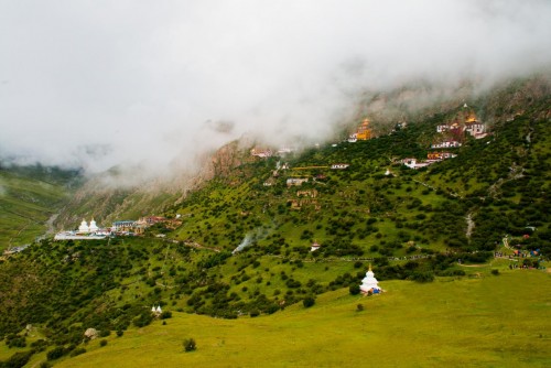 紅白相間的建筑群,牦?;蚬酚迫蛔缘玫嘏P著;偶爾有幾個僧人慢慢走過,或論著經(jīng)書,或拿水壺……世俗與修行,喧囂與寧靜,在這里有著絕妙地平衡。