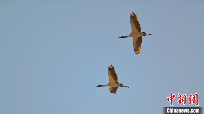 兩只黑頸鶴結(jié)伴翱翔,姿態(tài)優(yōu)美?!〗w波 攝