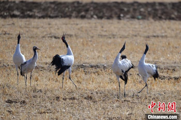 幾只黑頸鶴在收割后的青稞田間“高歌”?!〗w波 攝