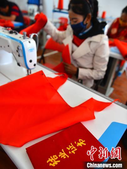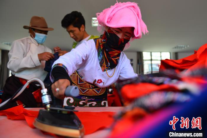 西藏山南森布日極高海拔地區(qū)生態(tài)搬遷安置點(diǎn)的牧民正縫制紅領(lǐng)巾。江飛波 攝