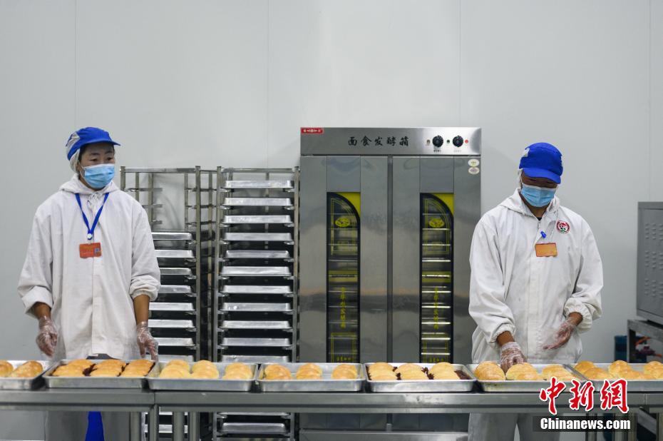 圖為7月28日,洛隆洛宗特色產(chǎn)品開發(fā)公司工人制作青稞面包。中新社記者 何蓬磊 攝