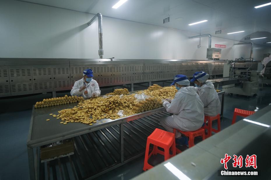 圖為7月28日,洛隆洛宗特色產(chǎn)品開發(fā)公司工人包裝青稞餅干。中新社記者 何蓬磊 攝