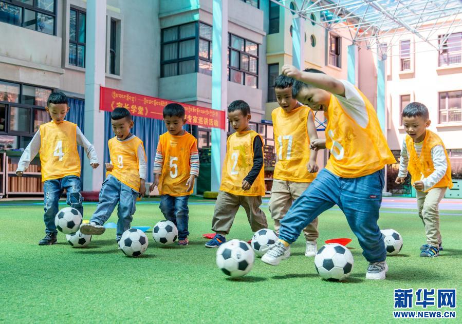 西藏自治區(qū)實(shí)驗(yàn)幼兒園大班的孩子在進(jìn)行足球訓(xùn)練(2019年8月22日攝)。新華社記者孫非 攝