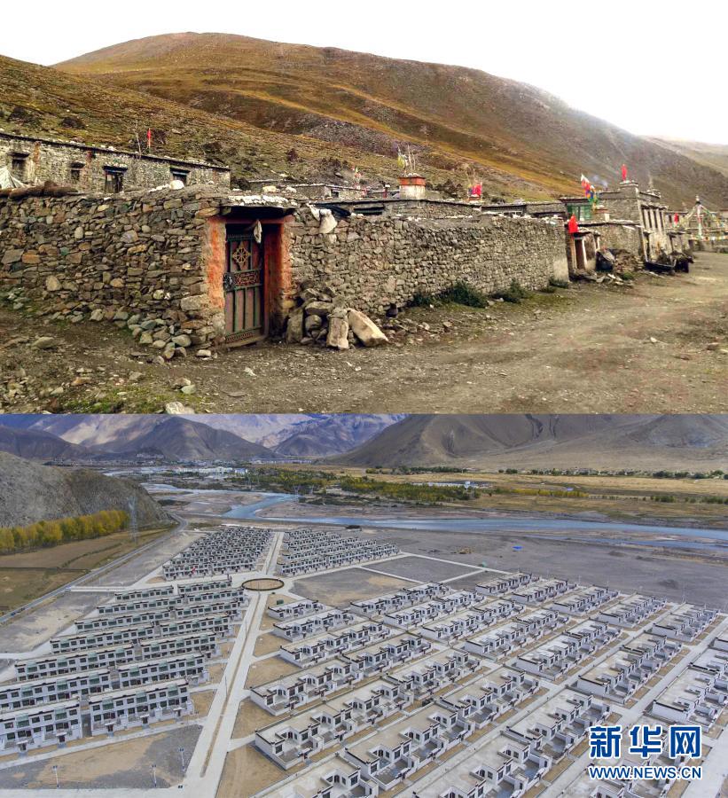 拼版照片:上圖是曾經(jīng)的西藏日喀則市拉孜縣查務(wù)鄉(xiāng)民房(資料照片);下圖是西藏日喀則市南木林縣孔阿村易地搬遷點(2018年9月28日南木加攝,無人機照片 )新華社發(fā)