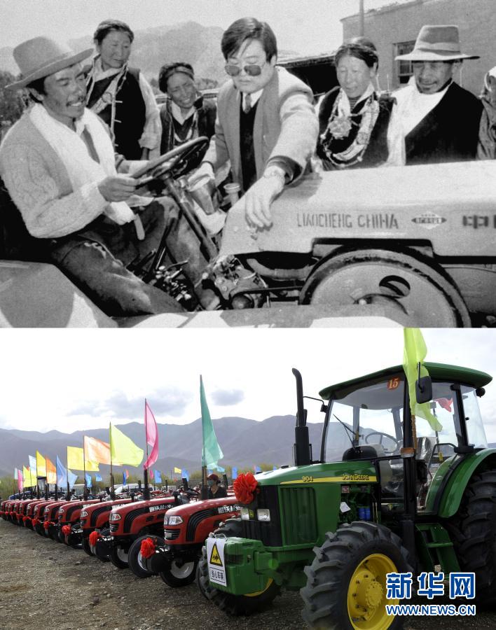 拼版照片:上圖是1996年,山東省援助西藏的首批農(nóng)機物資日前抵達日喀則。圖為山東援藏干部在給當(dāng)?shù)夭刈遛r(nóng)民講解農(nóng)機具的使用方法(新華社記者 土登 攝);下圖是2012年5月4日,西藏日喀則市白朗縣成為西藏自治區(qū)第一個農(nóng)業(yè)機械化示范縣。圖為停放在白朗縣田間的農(nóng)業(yè)機械(新華社記者 多吉占堆 攝)。新華社發(fā)