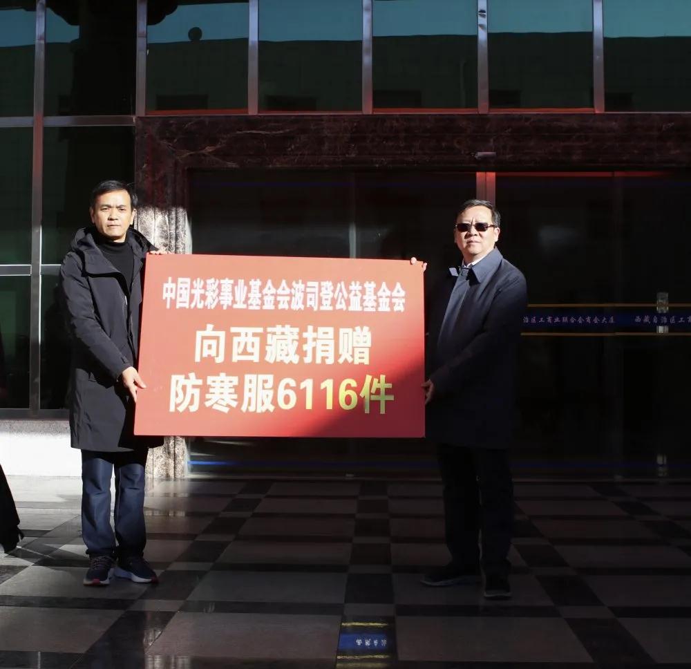捐贈(zèng)儀式上,王念東同志代表西藏接受捐贈(zèng)并向群眾代表發(fā)放波司登防寒服,對(duì)中國(guó)光彩事業(yè)基金會(huì)和波司登公益基金會(huì)表示感謝。波司登公益基金會(huì)共捐贈(zèng)價(jià)值人民幣389萬元的6116件羽絨服,惠及西藏4個(gè)市(地)6000余貧困群眾。