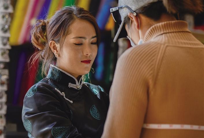 “老板,你家還有這款藏裝嗎?我想要一款。”在該店內(nèi),市民卓嘎拿出手機(jī),指著格桑措姆錄制的藏裝短視頻說道?!坝械?,這是我們今年推出的新款,是對(duì)傳統(tǒng)的藏裝進(jìn)行了改良,主要是體現(xiàn)在領(lǐng)口處,改良后的藏裝對(duì)領(lǐng)口部位進(jìn)行了復(fù)古簡(jiǎn)約化設(shè)計(jì),使其兼具美觀性與舒適性,再搭配一個(gè)‘卡烏’堪稱完美?!备裆4肽方榻B道。