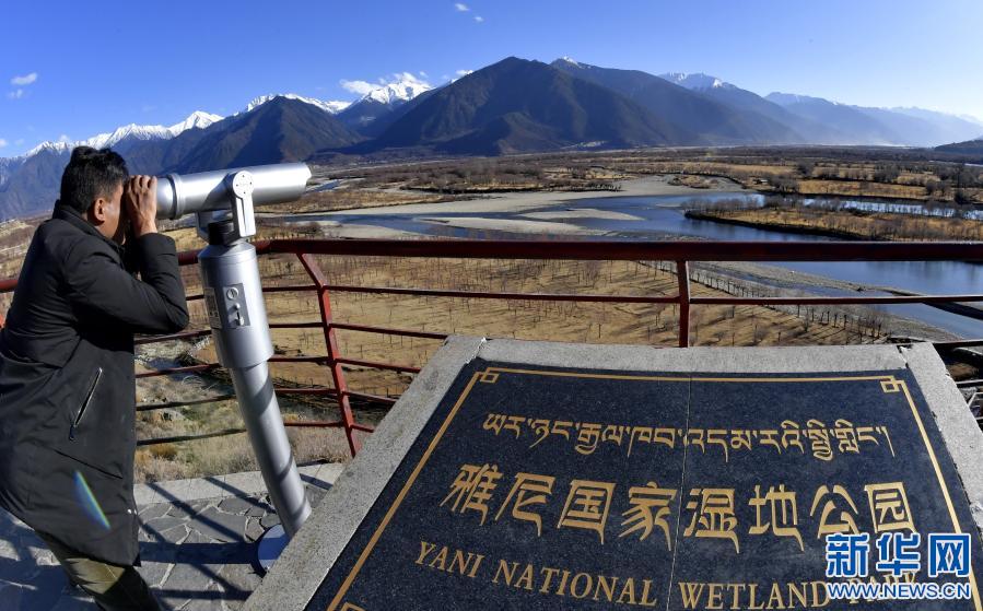 一名游客借助望遠鏡觀看西藏雅尼國家濕地公園的景色(2月2日攝)。新華社記者 張汝鋒 攝