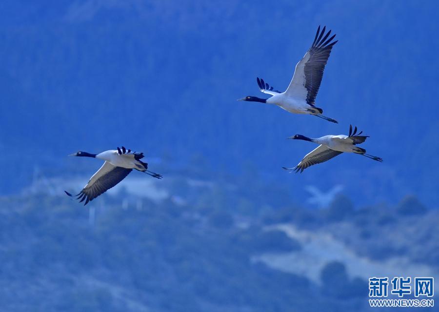 黑頸鶴在西藏雅尼國家濕地公園上空飛舞(2月1日攝)。新華社記者 張汝鋒 攝