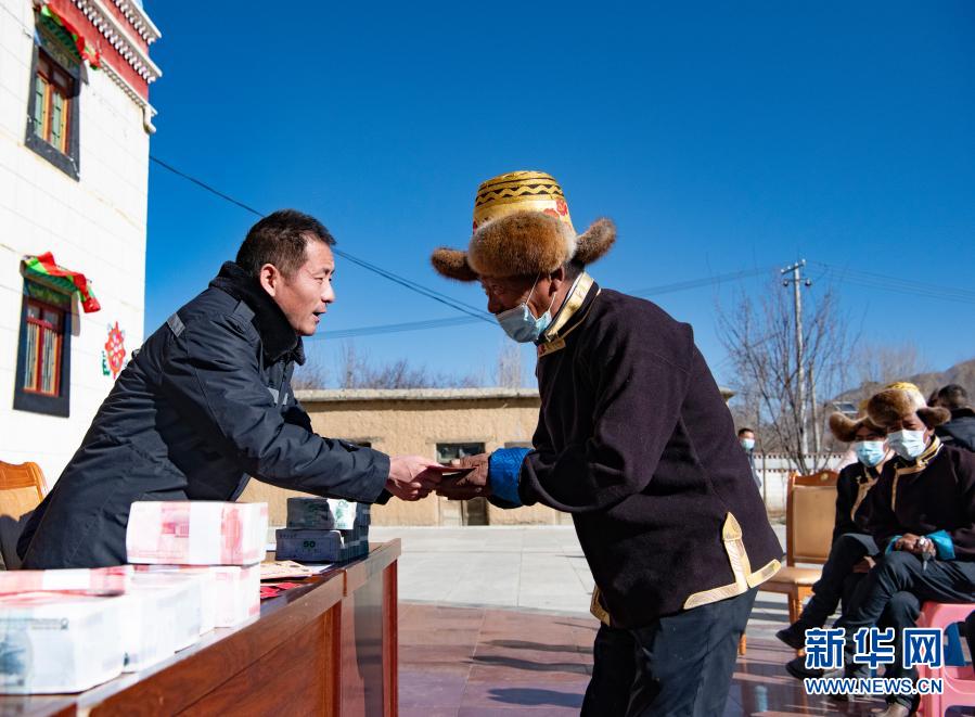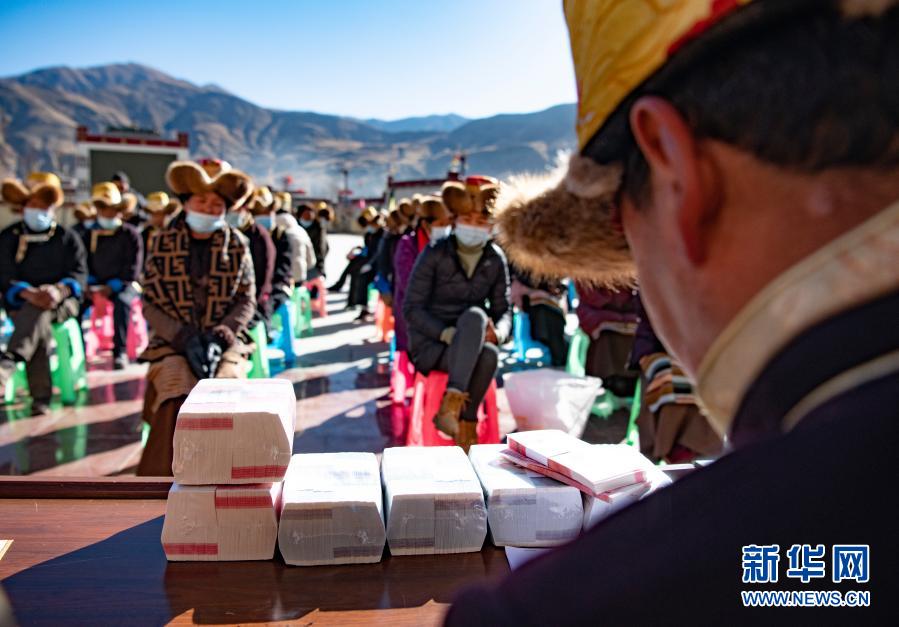 2月9日,在西藏民主改革第一村——山南市乃東區(qū)克松村社區(qū),農(nóng)民依次領(lǐng)取嶄新的百元鈔票,為即將到來的藏歷新年增添了喜慶的氛圍。新華社記者 普布扎西 攝