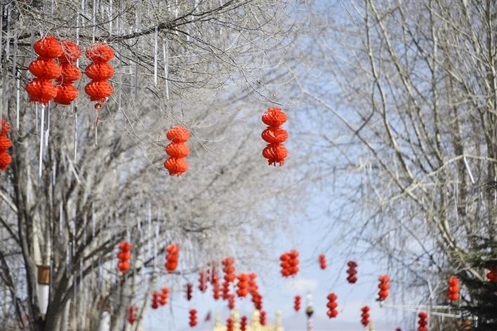 紅色總會(huì)給人以一種喜慶的感覺(jué)!走在拉薩的街頭,一串串紅彤彤的燈籠高高掛在樹(shù)枝上,錯(cuò)落有致,格外吸引眼球。除了大街小巷上用于裝飾的紅燈籠,過(guò)年時(shí)每個(gè)人家里也必定少不了紅色的點(diǎn)綴,走進(jìn)年貨市場(chǎng),人們左顧右盼,精心挑選著印有“扎西德勒”、“吉祥如意”等字樣的對(duì)聯(lián)、年畫(huà),此外,各種“?!痹氐募槲飩涫苁忻袂嗖A。