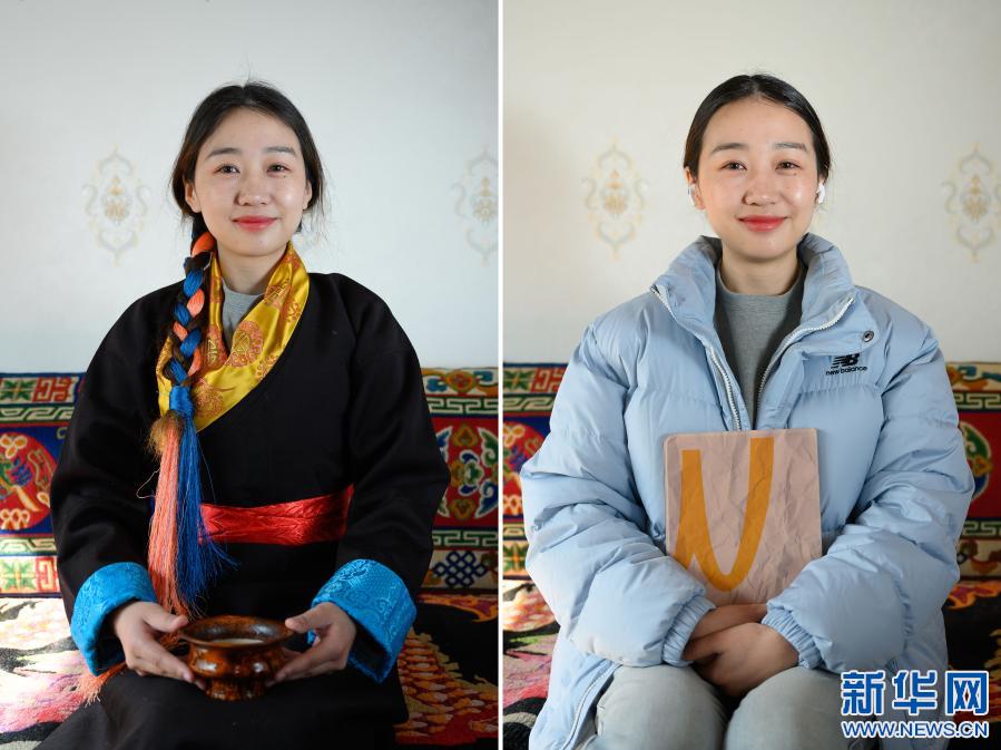 拼版照片:左圖為2月12日,在西藏自治區(qū)山南市乃東區(qū),格央身著傳統(tǒng)藏裝,手捧一碗酥油茶;右圖為2月12日,在西藏自治區(qū)山南市乃東區(qū),格央身著羽絨服,手持一臺平板電腦。新華社記者 劉金海 攝