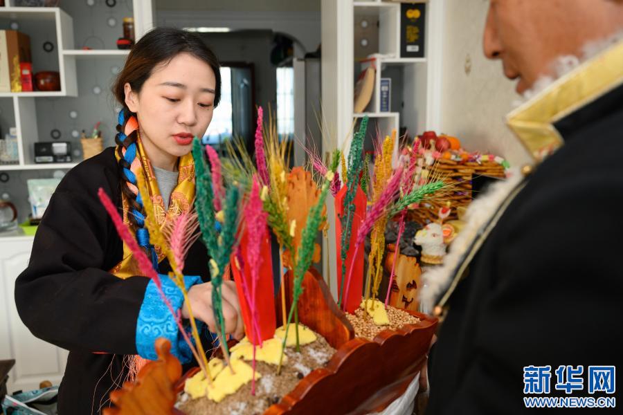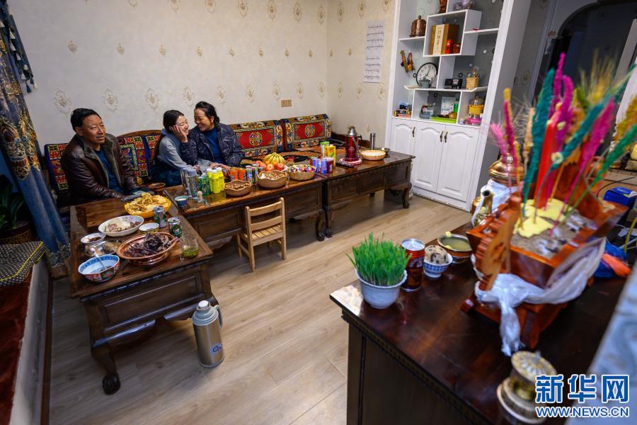 2月12日,在位于西藏自治區(qū)山南市乃東區(qū)的家中,格央(左)吃切瑪,慶祝藏歷新年。新華社記者 劉金海 攝