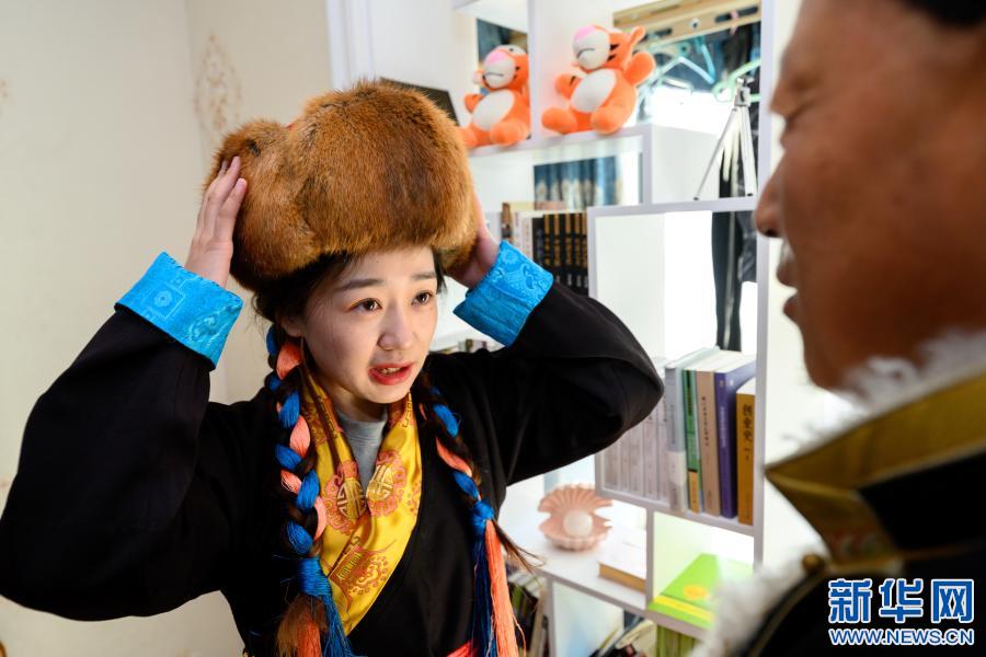 2月12日,在位于西藏自治區(qū)山南市乃東區(qū)的家中,格央佩戴藏帽。新華社記者 劉金海 攝