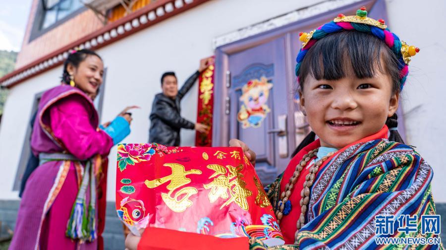 在西藏林芝市墨脫縣,張淳煥一家三口在家門前貼對(duì)聯(lián)(2月11日攝)。新華社記者 孫非 攝