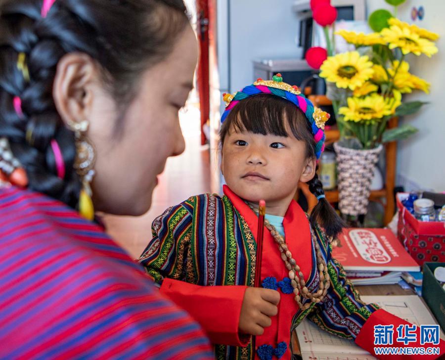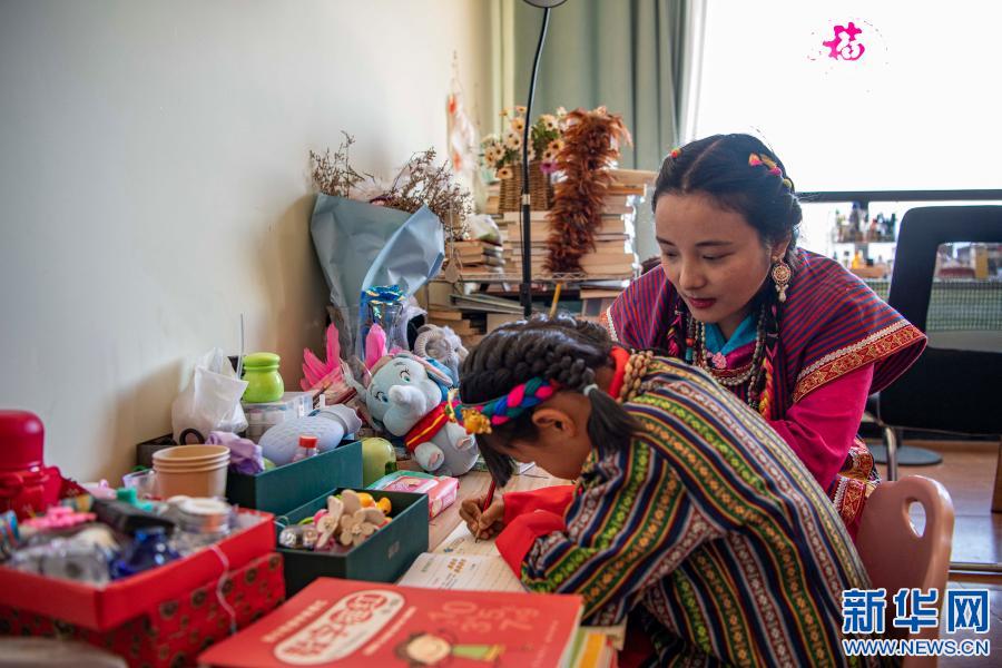 在位于西藏林芝市墨脫縣的家中,扎西玉珍指導(dǎo)女兒寫作業(yè)(2月11日攝)。新華社記者 孫非 攝