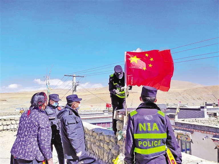 圖為崗巴縣移民警察與當地群眾一起歡度“雙節(jié)”,一起更換屋頂五星紅旗。扎西頓珠 攝