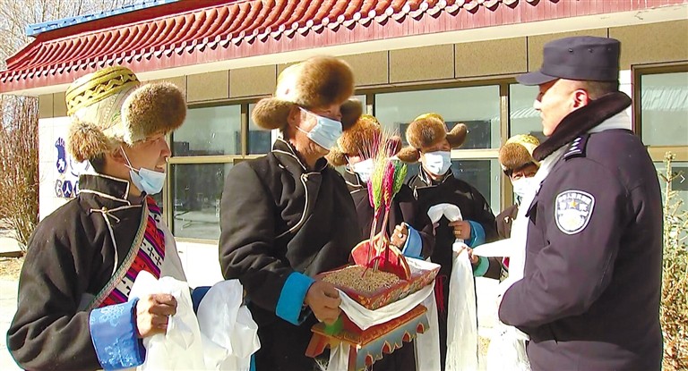 圖為康馬縣康馬鎮(zhèn)格龍村群眾和檢查站民警相互拜年。扎西頓珠 攝