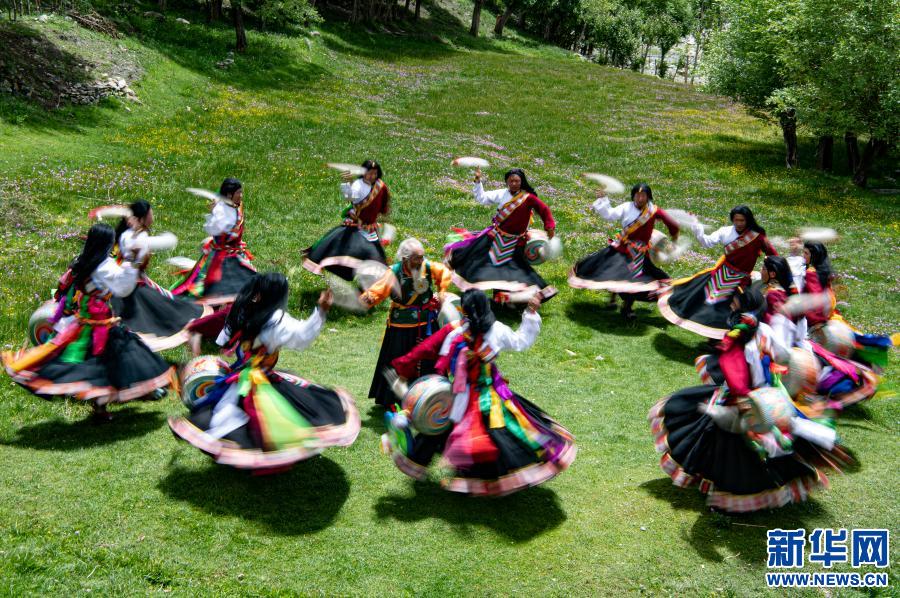 尼瑪(中)和弟子們?cè)诒硌荨熬煤幼课琛保?020年7月1日攝)。新華社記者 普布扎西 攝