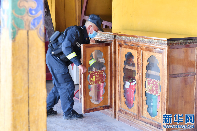 布達(dá)拉宮消防救援大隊(duì)隊(duì)員在巡邏期間檢查消防設(shè)施(3月4日攝)。新華社記者 孫瑞博 攝