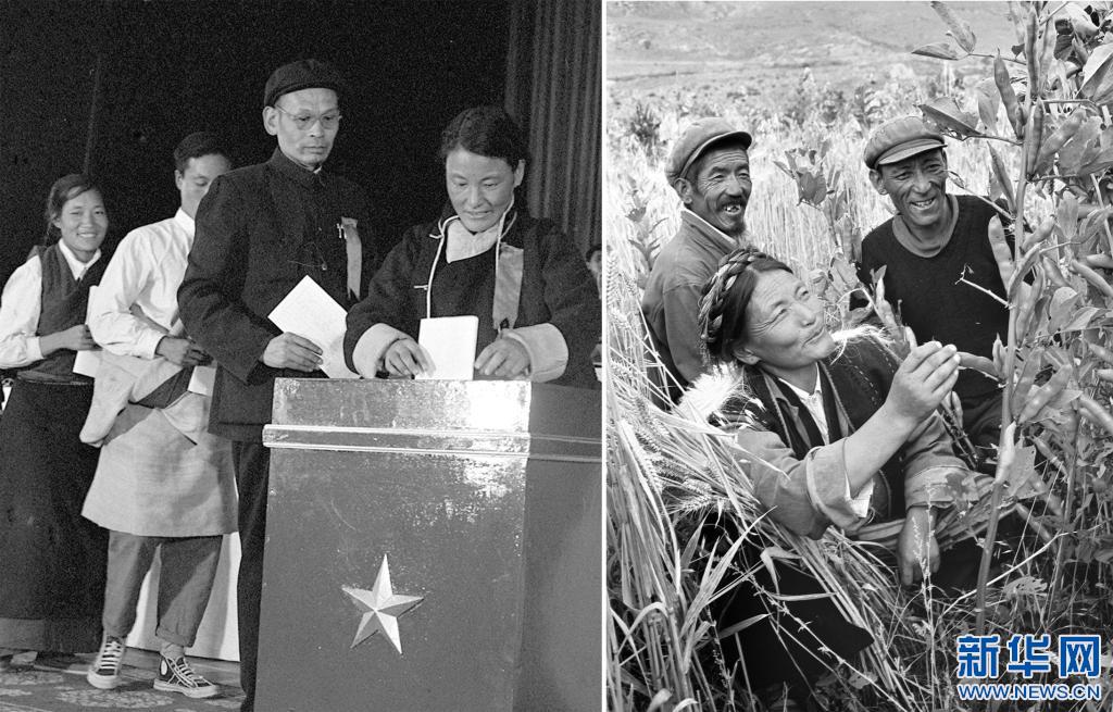 拼版照片:左圖:1965年9月8日,西藏自治區(qū)第一屆人民代表大會第一次會議選舉了西藏自治區(qū)主席、副主席和自治區(qū)人民委員會委員。 次仁拉姆(右一)作為代表正在投票。(新華社資料照片)。右圖:1979年次仁拉姆(前)帶領公社社員開展科學種田,在田間觀察冬小麥和蠶豆套種情況(新華社資料照片)。新華社發(fā)