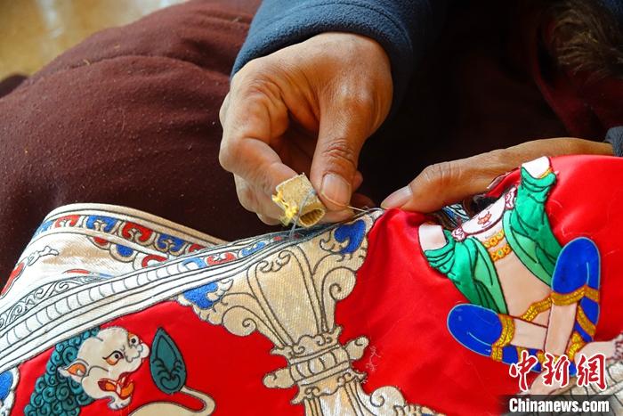4月5日,拉薩堆繡唐卡技藝傳承人羅布正在進行創(chuàng)作。中新社記者 冉文娟 攝