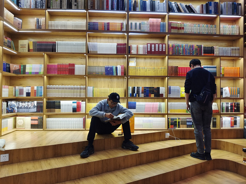 傍晚7點(diǎn),在萬達(dá)廣場的“央喜書吧”里,與朋友約好吃飯的市民拉姆趁著朋友還沒到,抽空選購著書籍;
