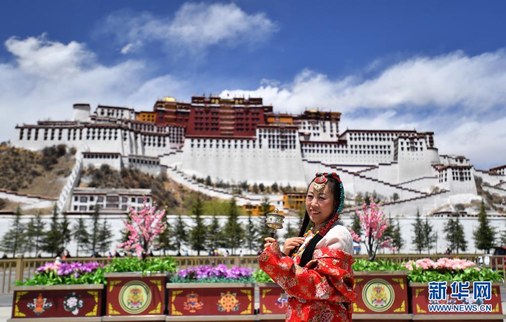 4月23日,來(lái)自重慶的游客在布達(dá)拉宮廣場(chǎng)留影。新華社記者 覺(jué)果 攝