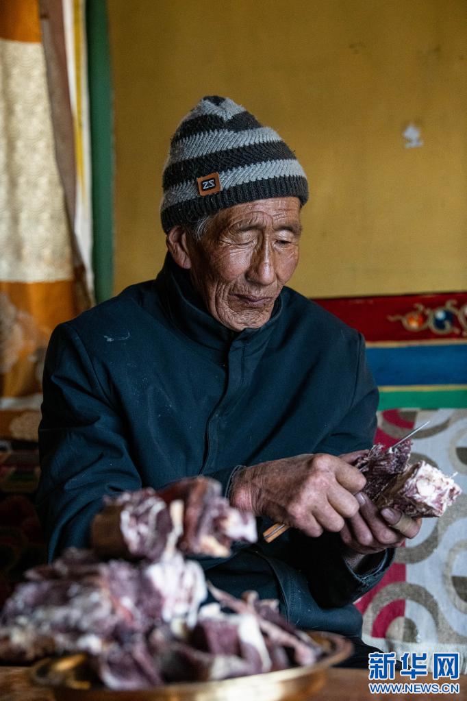 次仁老人在拉薩市當(dāng)雄縣寧中鄉(xiāng)麥靈村的家里吃風(fēng)干牦牛肉(4月16日攝)。新華社記者 孫瑞博 攝