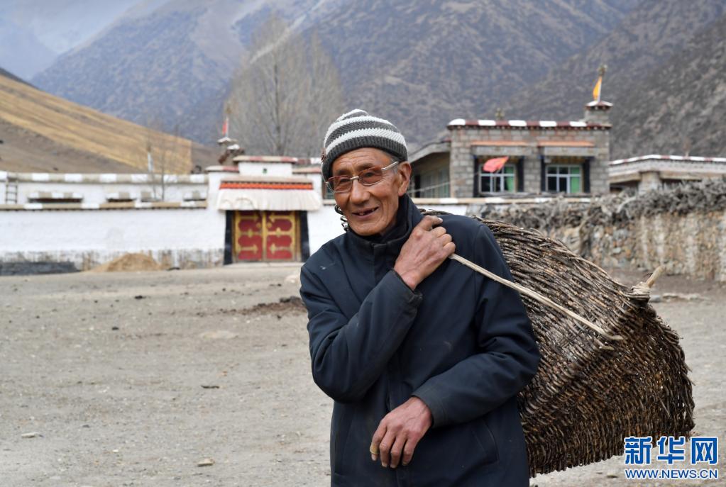 在拉薩市當(dāng)雄縣寧中鄉(xiāng)麥靈村,次仁老人背著籮筐出門取干牛糞(4月16日攝)。新華社記者 覺果 攝