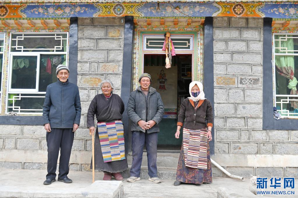 次仁老人(左一)在拉薩市當(dāng)雄縣寧中鄉(xiāng)麥靈村的家里和家人合影(4月16日攝)。新華社記者 孫瑞博 攝