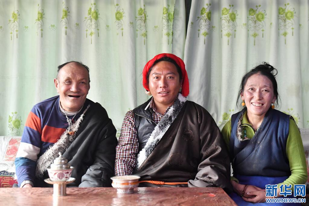 央多老人(左)和養(yǎng)子及養(yǎng)子的妻子在家里合影(4月15日攝)。新華社記者 孫瑞博 攝