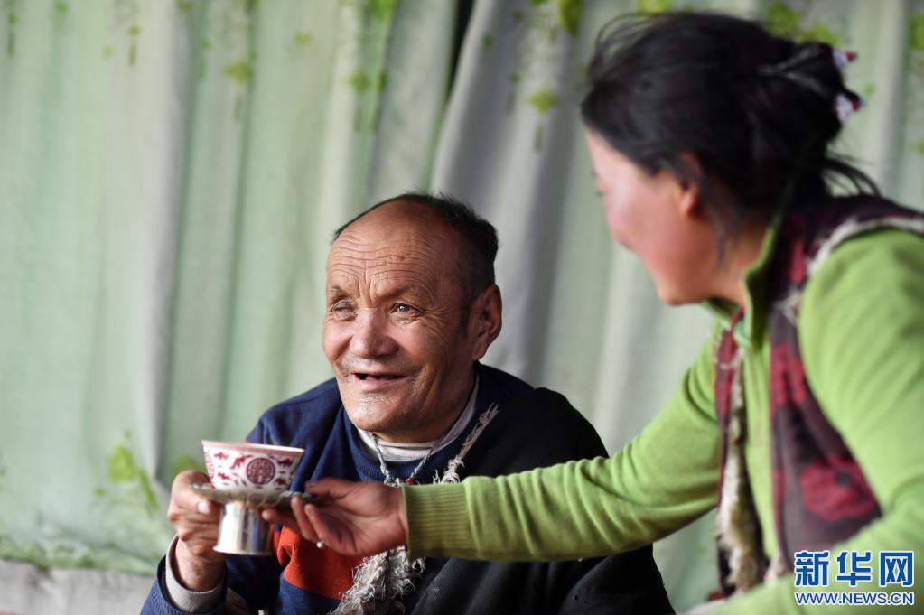 親屬在給央多老人(左)敬茶(4月15日攝)。新華社記者 覺果 攝