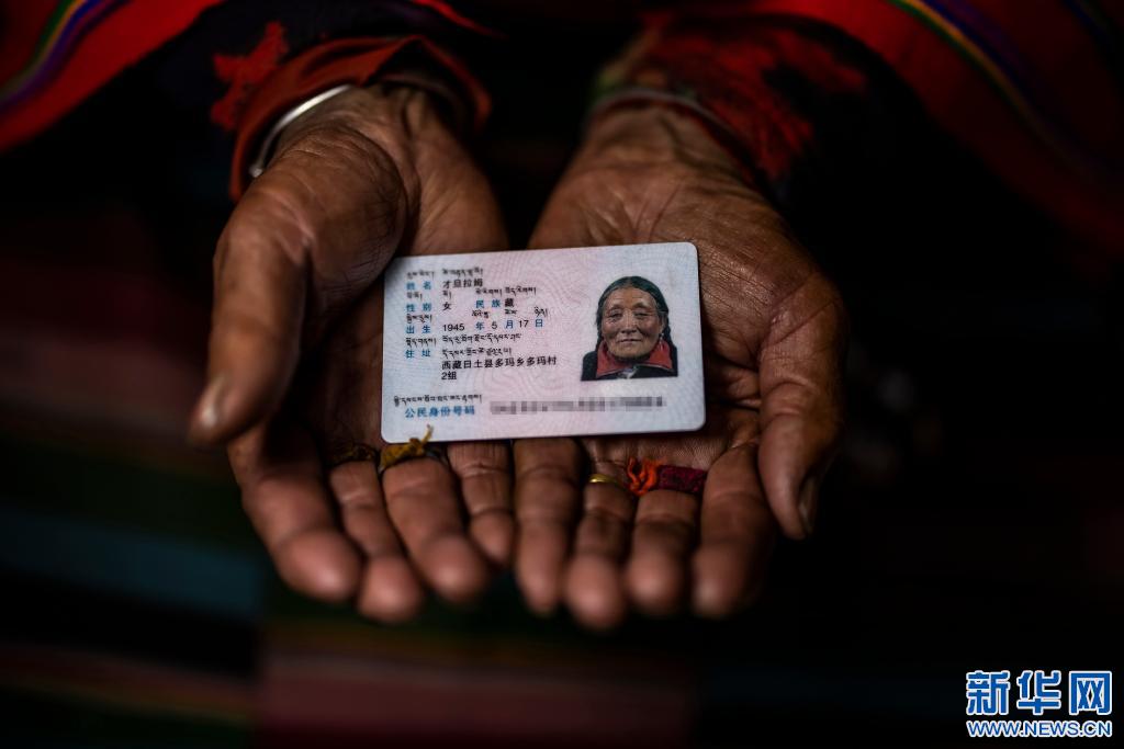 才旦拉姆老人的身份證(4月27日攝)。新華社 貢覺群培 攝