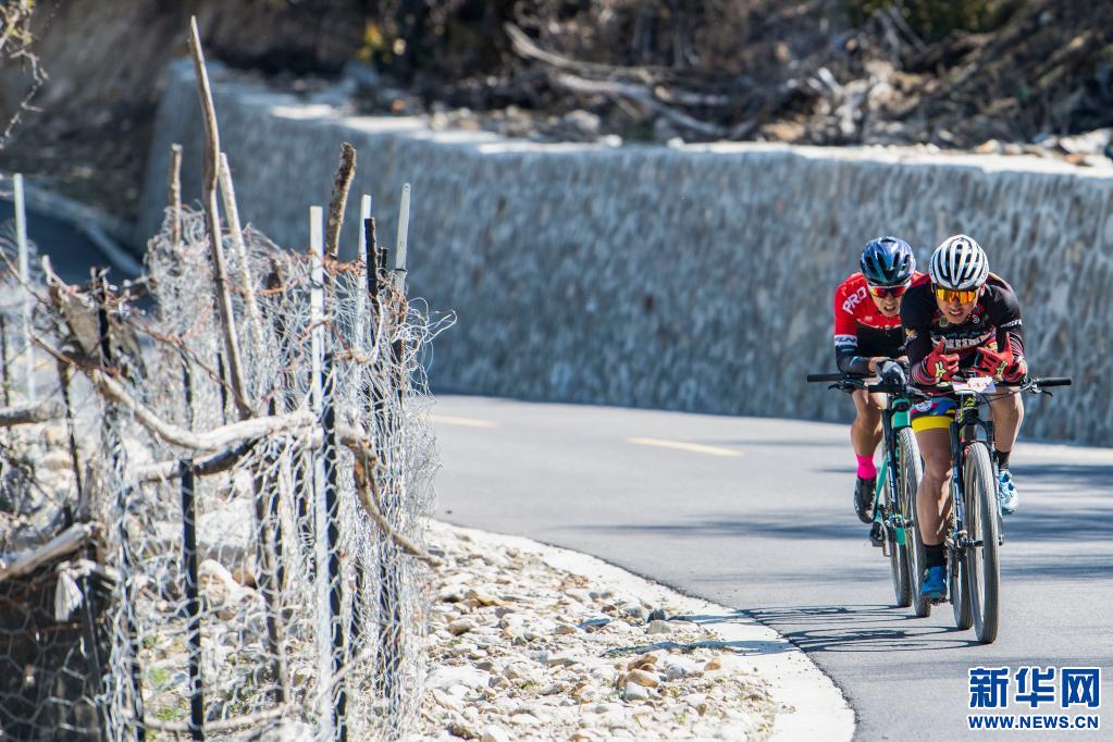 5月1日,首日比賽中獲得男子組第一的西藏本地選手扎頓(前)在比賽中騎行。新華社記者 孫瑞博 攝