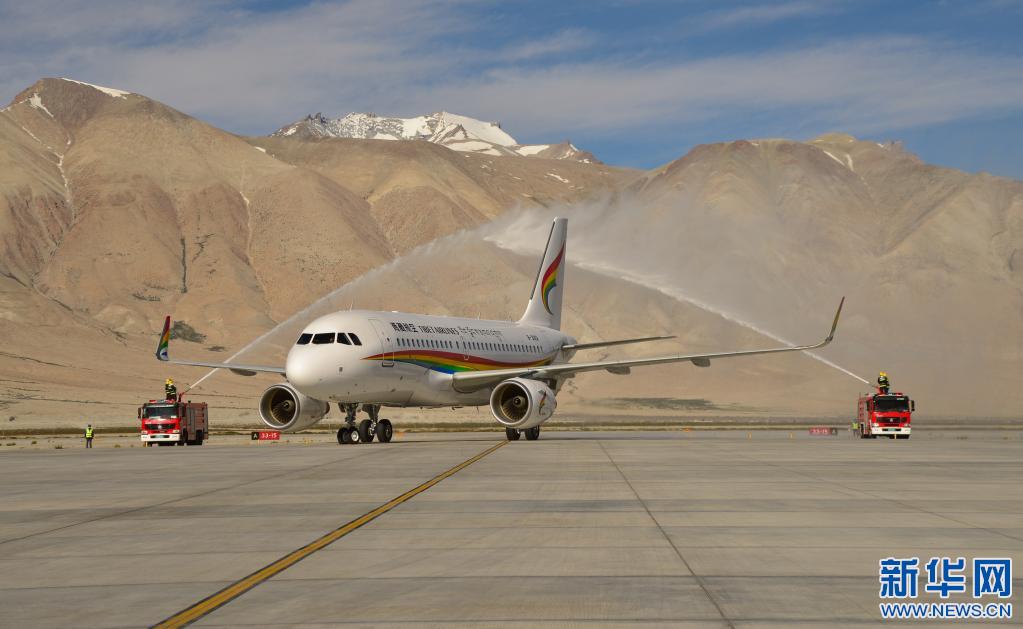 2020年7月1日,阿里昆莎機(jī)場(chǎng)通航10周年,飛機(jī)穿過(guò)水門。新華社記者田金文 攝