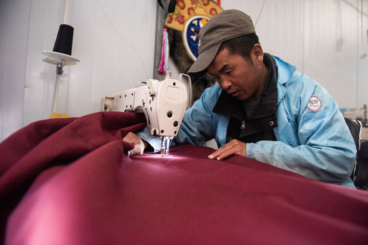 走進(jìn)廠房,只能聽(tīng)見(jiàn)縫紉機(jī)轉(zhuǎn)動(dòng)的聲音。平措占堆坐在縫紉機(jī)前,雙眼盯著跳動(dòng)的針頭,手推深紅色布料伸展開去,這是制作藏式門簾的步驟之一。
