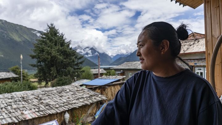 次仁德吉站在自家民宿二樓眺望(2020年9月15日攝)。新華社記者 王沁鷗 攝