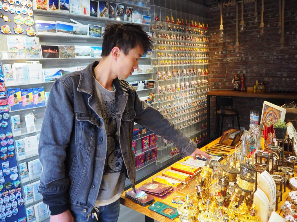 40多平方米的小店四周擺放著貨架,西藏特產(chǎn)和文創(chuàng)產(chǎn)品整齊地碼在上面,沒有一點(diǎn)灰塵。