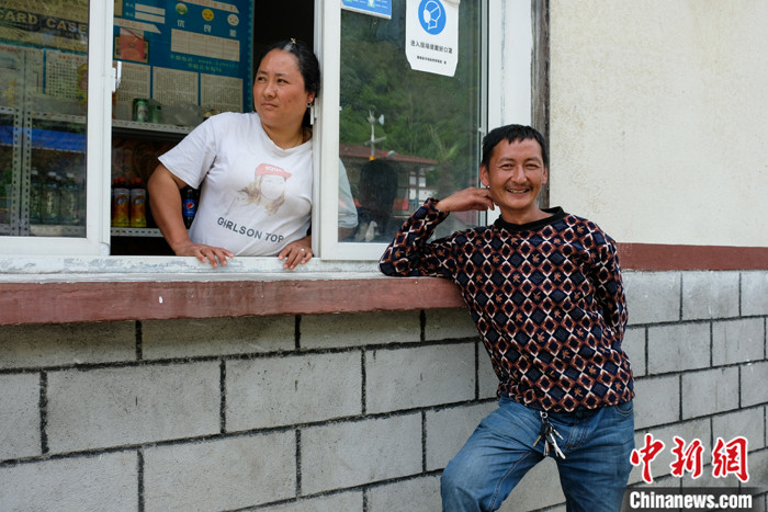 圖為5月16日,西藏墨脫縣墨脫鎮(zhèn)門巴族民眾扎巴和妻子梅朵曲珍在自家小商店門口,通公路前扎巴是一位背夫。 中新社記者 江飛波 攝