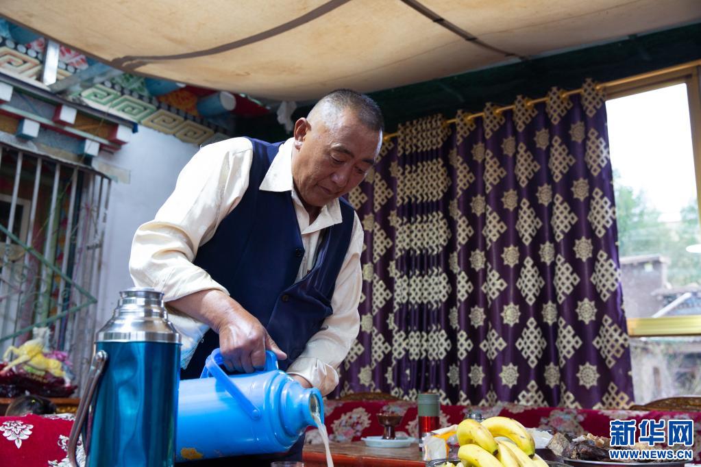 洛瓊在倒酥油茶。(阿旺龍都攝)