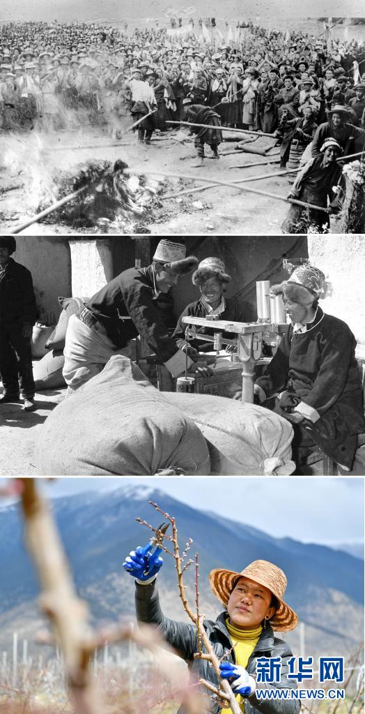 這是一張拼版照片:上圖為1959年8月,西藏墨竹工卡縣的翻身農(nóng)奴焚燒三大領(lǐng)主的剝削文契(新華社發(fā));中圖為1984年,江孜縣農(nóng)民洛桑旺堆(左)向國(guó)家出售余糧。他家承包土地100多畝,農(nóng)忙種地,農(nóng)閑搞建筑、跑運(yùn)輸(新華社記者土登攝);下圖為2020年3月22日,西藏林芝現(xiàn)代蘋果標(biāo)準(zhǔn)化示范園的工作人員為桃樹(shù)剪枝。該示范園實(shí)施農(nóng)機(jī)農(nóng)藝結(jié)合、水肥一體化及“果草畜循環(huán)”,大面積推廣蘋果矮砧集約高效栽培技術(shù),帶動(dòng)米林縣羌納鄉(xiāng)林巴、才巴、色沃村及附近的農(nóng)戶增收(新華社記者 張汝鋒 攝)。新華社發(fā)