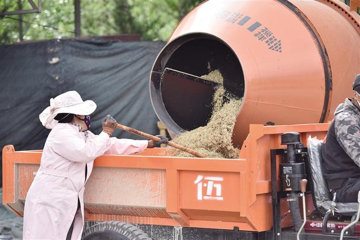 工作人員對種子進行飛播前加工。