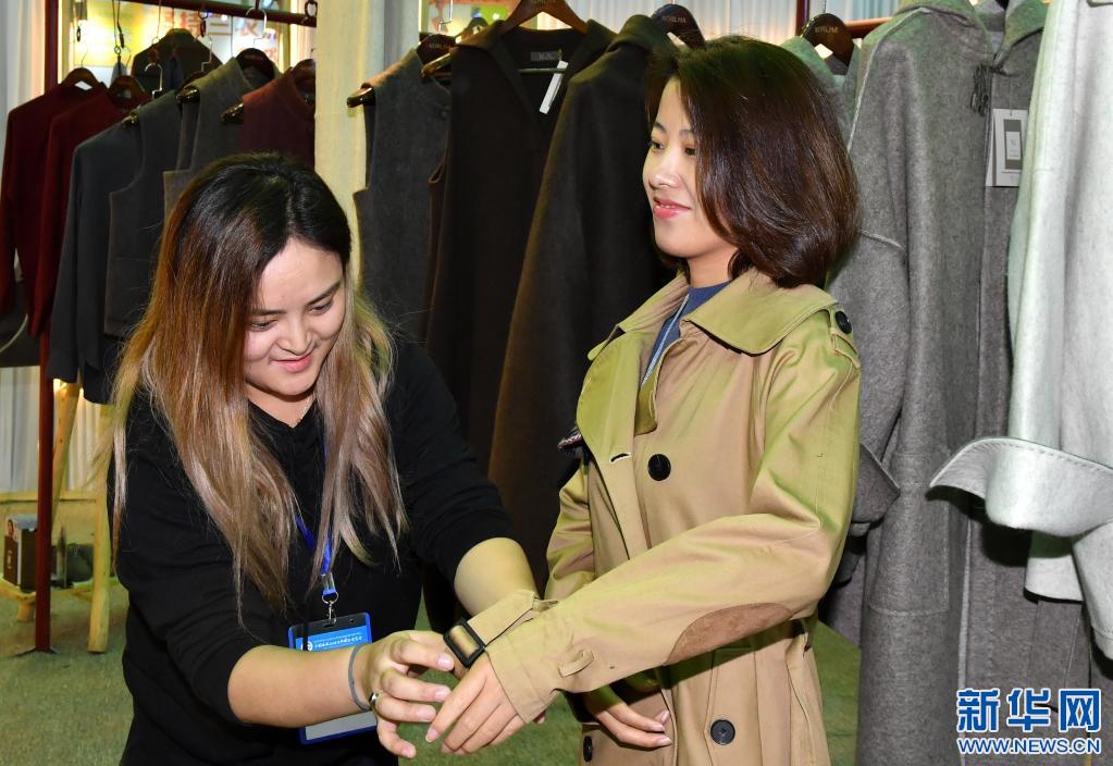 顧客在藏博會上試穿當(dāng)?shù)禺a(chǎn)的服裝(2018年9月8日攝)。 新華社記者 覺果 攝