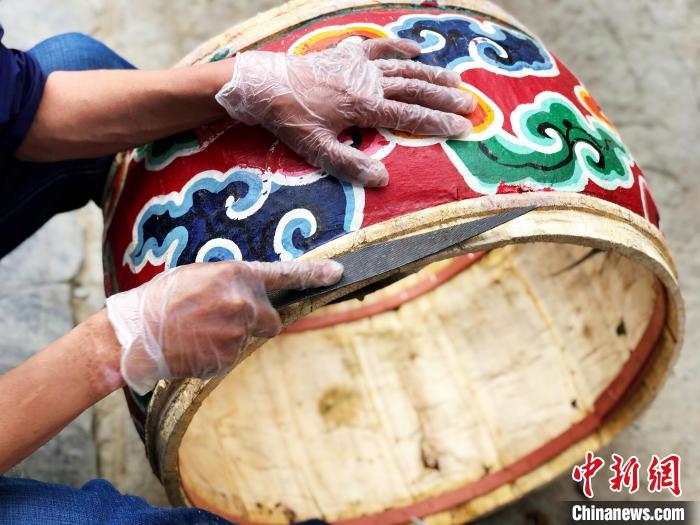 圖為正在制作中的藏戲鼓。冉文娟 攝
