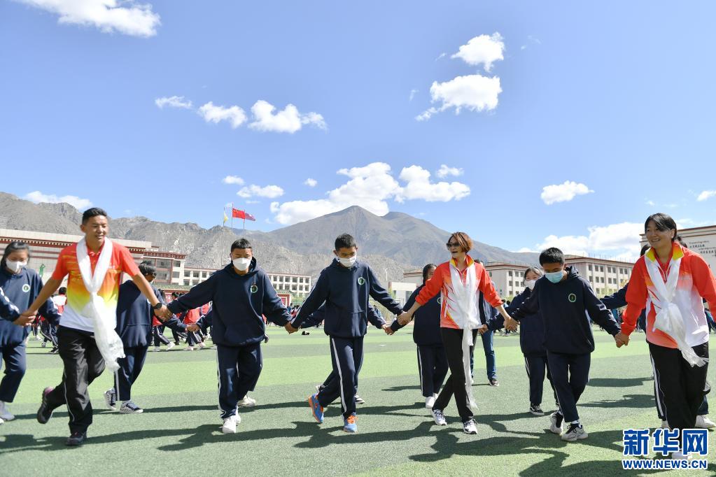 6月25日,跳水奧運(yùn)冠軍高敏(前右三),西藏和平解放以來(lái)首個(gè)競(jìng)技體育世界冠軍、摔跤運(yùn)動(dòng)員西洛卓瑪(前右一)和成功登頂七大洲最高峰并徒步到達(dá)南北極點(diǎn)的西藏登山運(yùn)動(dòng)員德慶歐珠(前左一)在拉薩市阿里高級(jí)中學(xué)和學(xué)生們一起跳鍋莊課間操。新華社記者 孫瑞博 攝
