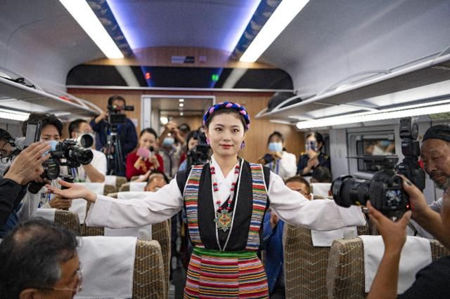 西藏首列復(fù)興號的列車員在進行當(dāng)?shù)胤棻硌?6月25日攝)。 新華社記者 普布扎西 攝